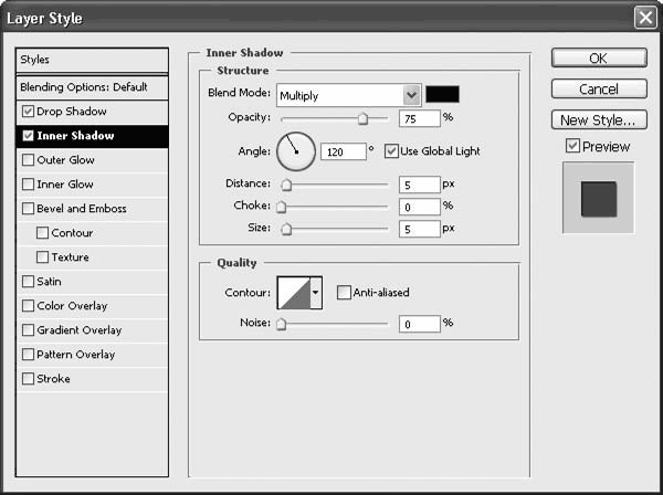 Настройки раздела Inner Shadow (Внутренняя тень) полностью идентичны настройкам раздела Drop Shadow (Падающая тень) – единственным различием является положение тени: внутри, а не за пределами объекта. Настройка жесткости тени здесь называется не Spread (Распространение), а Choke (Сжатие), однако ее суть и результат не меняются.