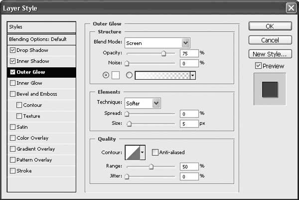 Рис. 21.11. Раздел Outer Glow (Внешнее свечение) окна Layer Style (Стиль слоя)