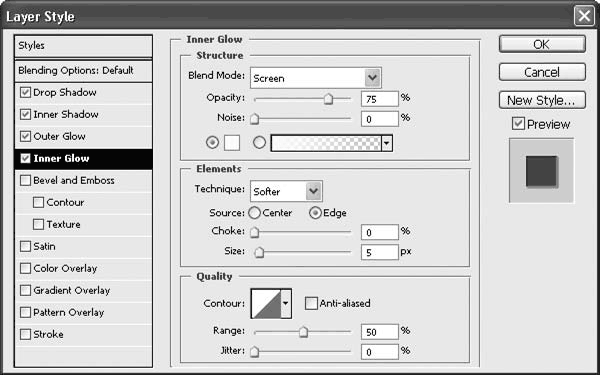 Раздел Inner Glow (Внутреннее свечение) (рис. 21.14) позволяет создавать свечение внутри объекта. Большинство настроек этого раздела идентичны настройкам раздела Outer Glow (Внешнее свечение).