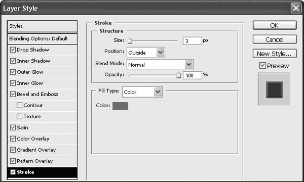 В области Structure (Структура) ползунок и числовое поле Size (Размер) определяют размер (толщину) абриса в пикселах. Раскрывающийся список Position (Положение) позволяет выбрать положение абриса относительно границ слоя: Outside (Снаружи), Inside (Внутри) или Center (По центру).