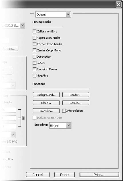 В правой части окна отображается один из двух наборов настроек, который зависит от выбора значения из раскрывающегося списка в верхней части: значение Color Management (Управление цветом) отображает настройки для управления цветом печати (см. рис. 23.1), а значение Output (Вывод) позволяет задать некоторые дополнительные параметры, требуемые при распечатывании изображения в типографии или при его подготовке для передачи в типографию (рис. 23.2).