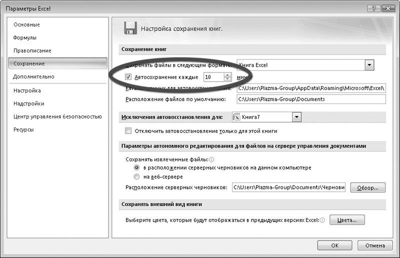 В программе Excel предусмотрена функция автоматического сохранения документа через заданный интервал времени. Чтобы активизировать эту функцию, нужно выполнить следующие действия.