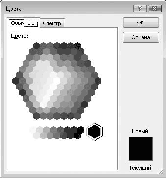 Диалоговое окно Цвета содержит две вкладки. На вкладке Обычные вы можете выбрать любой из предложенных образцов, щелкнув на нем кнопкой мыши. Если требуется точно подобрать нужный оттенок, следует воспользоваться вкладкой Спектр.