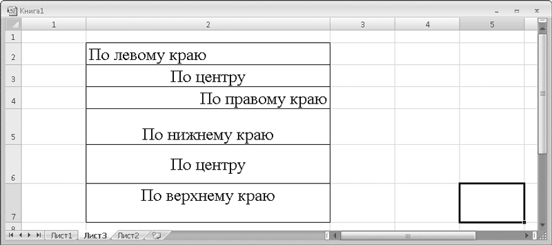 Выше расположены кнопки для установки вертикального выравнивания. По умолчанию данные прижимаются к нижней границе ячейки, что особенно заметно, когда высота ячейки значительно превышает высоту находящихся в ней символов. С помощью кнопок, расположенных над кнопками горизонтального выравнивания, вы можете изменить вертикальное выравнивание, то есть прижать данные к верхней границе ячейки, или разместить их по центру, то есть равноудаленно от верхнего и нижнего краев ячейки (рис. 3.7).