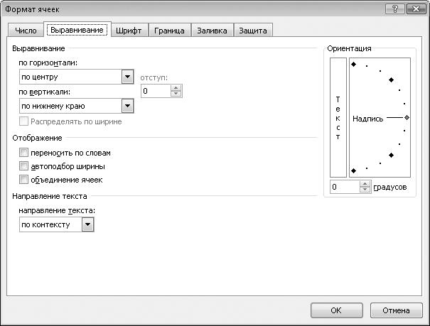 Рис. 3.8. Вкладка Выравнивание диалогового окна Формат ячеек