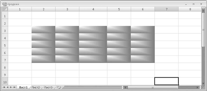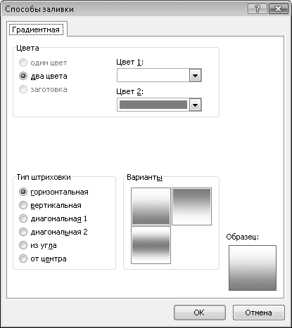 Градиентная заливка – это заливка, в которой один цвет плавно переходит в другой. Существуют и многоцветные градиенты, состоящие из двух и более цветов, но в Excel используются только двухцветные градиенты (рис. 3.13).