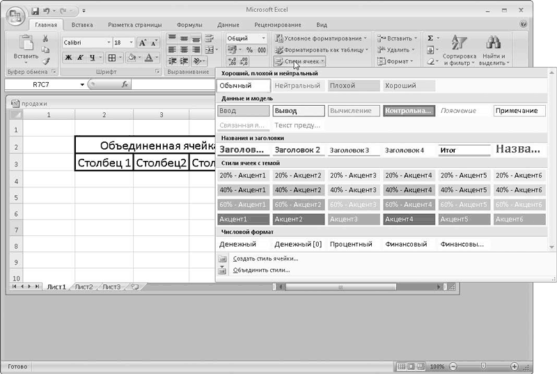 Чтобы применить к ячейке или диапазону готовый стиль, нужно предварительно выделить эту ячейку или диапазон. Далее нажмите кнопку Стили ячеек, расположенную в группе Стили вкладки Главная ленты. Появится галерея стилей (рис. 3.17).
