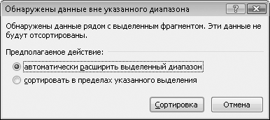 2. Выделите столбец 1 и нажмите кнопку Сортировка от А до Я. Появится диалоговое окно Обнаружены данные вне указанного диапазона.