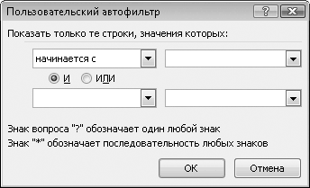 4. Нажмите кнопку ОК диалогового окна. Как видите, в таблице были скрыты все строки, кроме строк с товарами, названия которых начинаются на указанные нами буквы (рис. 5.11).