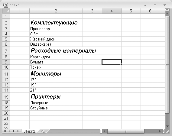Создадим новую таблицу, чтобы рассмотреть пример создания структуры. В определенной ячейке укажите название группы товаров, а в нижерасположенные ячейки введите наименования товаров данной группы. Затем введите название следующей группы товаров, потом – наименования товаров этой группы. И так далее, пока весь прайс-лист не будет составлен. В дальнейшем вы сможете добавить или удалить строки, чтобы добавить новый товар или удалить ненужный.