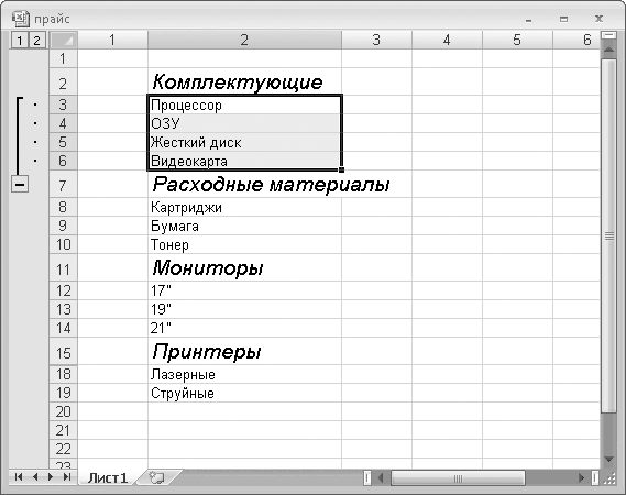 8. Аналогичным образом сгруппируйте строки товаров остальных групп (ячейки строк 12– 14 и 18– 19). Слева от заголовков строк должны появиться четыре кнопки, которыми можно скрыть или отобразить товары каждой группы.