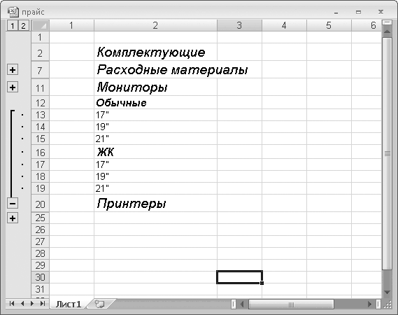 • Нажмите кнопку 1. Все группы товаров будут свернуты, а сгруппированные строки скрыты (рис. 5.19).