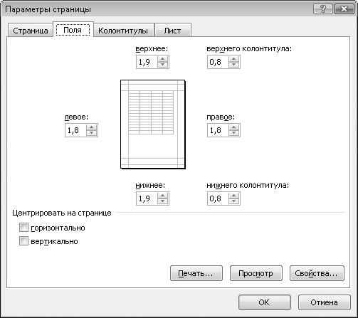 Если установить флажок Горизонтально, печатаемый фрагмент будет расположен равноудаленно от левого и правого полей, в противном случае печатаемая область будет прижата к границе левого поля. Если установлен флажок Вертикально, печатаемый фрагмент центрируется относительно верхнего и нижнего поля.