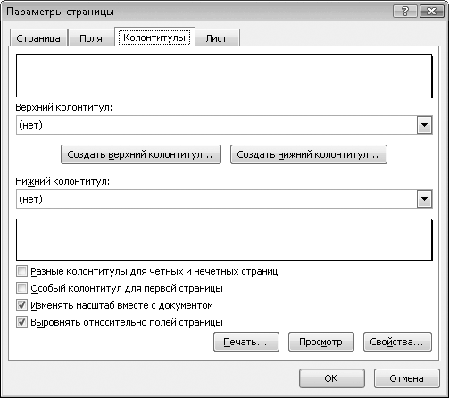Перейдем на вкладку Колонтитулы (рис. 11.3). Колонтитул – это информация, которая выводится в верхней или нижней (или и в верхней, и в нижней) части каждого листа. Примером колонтитула может быть номер страницы или название главы книги.