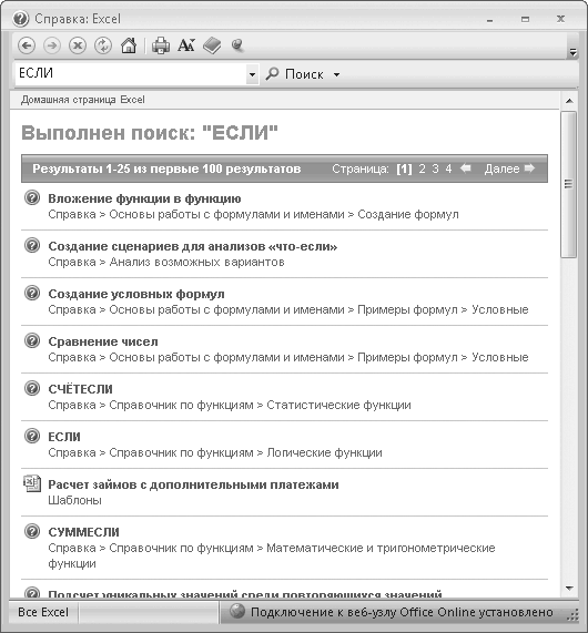 Кроме того, с каждой новой версией пакета Microsoft Office более понятной и доступной становится и справочная система. Справочная система программы Excel 2007 максимально подробно освещает все аспекты работы с электронными таблицами, а при наличии соединения с сетью Интернет возможности справочной системы становятся буквально безграничными. К вашим услугам подробнейшая информация о любой функции или настройке программы, снабженная конкретными примерами, которые вы тут же можете применить в своем документе и посмотреть, как работает та или иная функция. Используйте мощь справочной системы, если что-то в этой книге вам показалось не совсем понятным.