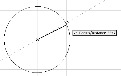 2. Определите радиус строящегося элемента, переместив указатель мыши на необходимое расстояние. При выполнении этого действия на экране будет динамически отрисовываться окружность, а также подобно действию построения линии отображаться «резиновая нить», указывающая текущее положение радиуса, и табло с информацией о его длине (рис. 3.11).