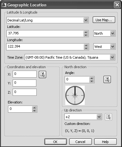 Данное окно предназначено для указания географического расположения модели, что впоследствии отразится на освещении модели солнцем.