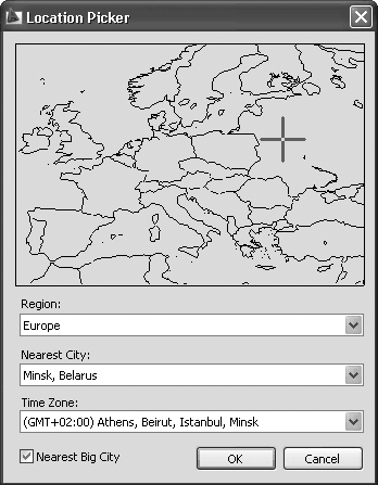 Установите флажок Nearest Big City (Ближайший крупный город) и выберите нужный город из списка Nearest City (Ближайший город). Можно также щелкнуть кнопкой мыши на карте – при этом красный крестик переместится к крупному городу, ближайшему к указанному месту. Имейте в виду, что список городов и рисунок, отображаемый на карте, зависят от выбранных материка или страны в раскрывающемся списке Region (Регион). В зависимости от пункта, выбранного в списке Time Zone (Часовой пояс), автоматически будет установлен часовой пояс.
