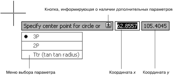 Когда вы наберете команду и нажмете клавишу Enter, рядом с курсором появится запрос команды и, может быть, одно или два поля для ввода данных. Например, два поля появляются, если требуется указать координаты точки: в первое поле следует ввести координату x, а во второе – координату y. Переключаться между окнами для ввода данных можно с помощью клавиши Tab.