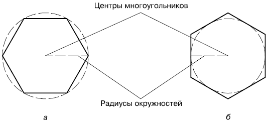 Рис. 2.16. Построение многоугольника и окружности, описанной около него (а) и вписанной в него (б)