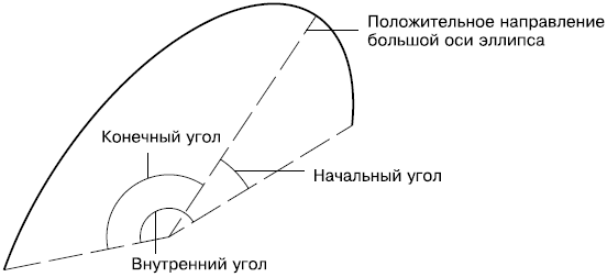Следует знать, что и начальный, и конечный углы эллиптической дуги отсчитываются от большой оси полного эллипса. Сначала это может показаться непривычным, однако на практике данный способ использовать гораздо удобнее, чем если бы углы были привязаны к ПСК. А вот внутренний угол, естественно, отсчитывается от начального угла.