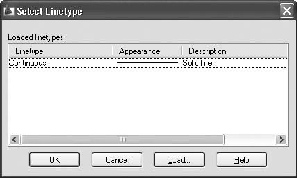 • После щелчка на столбце Linetype (Тип линии) открывается диалоговое окно Select Linetype (Выбор типа линии) (рис. 2.29), где по умолчанию присутствует всего один шаблон линии – Continuous (Сплошная).