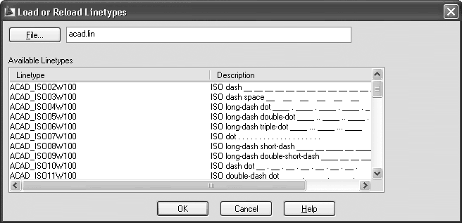 Чтобы загрузить дополнительные типы линий, щелкните на кнопке Load (Загрузить). На экране появится диалоговое окно Load or Reload Linetypes (Загрузить или перезагрузить типы линий) (рис. 2.30).