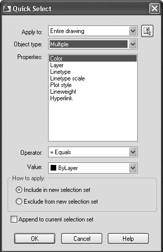 2. В диалоговом окне Quick Select (Быстрый выбор) установите флажок Append to current selection set (Добавить к текущему набору выделения).