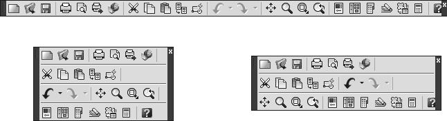 Панели инструментов могут быть закрепленными (в таком состоянии они отображаются по умолчанию) и плавающими. Название плавающей панели инструментов можно увидеть во всплывающей подсказке при наведении указателя мыши на панель. Для закрытия плавающей панели инструментов предназначена кнопка с крестиком, расположенная в правой части. Кнопки плавающей панели инструментов могут располагаться как в один ряд, так и в несколько. Чтобы сделать панель плавающей, достаточно перетащить ее с помощью мыши на некоторое расстояние от края графического экрана. На рис. 1.9 показана плавающая панель инструментов Standard (Стандартная) с различным расположением кнопок.
