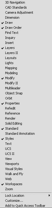 Всего в AutoCAD 2009 имеется 38 панелей инструментов. Чтобы отобразить или скрыть панель инструментов, щелкните на любой из них правой кнопкой мыши. На экране появится меню, содержащее список доступных панелей. Для отображения/скрытия любой из панелей выберите ее в меню. В нижней части меню расположено подменю Lock Location (Место фиксации), с помощью которого вы можете блокировать положение панелей инструментов и палитр. Так, например, чтобы отобразить панель инструментов View (Вид) и блокировать ее, необходимо выполнить следующие действия.