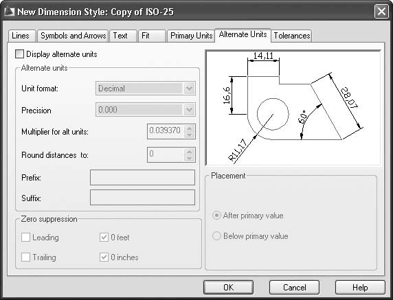 Параметры Prefix (Префикс), Suffix (Суффикс) и флажки в области Zero supression (Подавление нулей) настраивают так же, как для основных единиц. Например, чтобы разместить после альтернативных единиц запись мм, введите в поле Suffix (Суффикс) соответствующее значение.