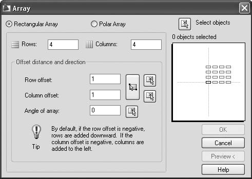 В верхней части окна расположен переключатель, позволяющий выбрать тип массива: прямоугольный или полярный. Справа от него расположена кнопка Select objects (Выбор объектов), нажав которую можно выбрать объекты для копирования. Содержимое центральной части окна изменяется в зависимости от выбранного типа массива. Здесь можно указать различные параметры копирования. Справа находится область предварительного просмотра.