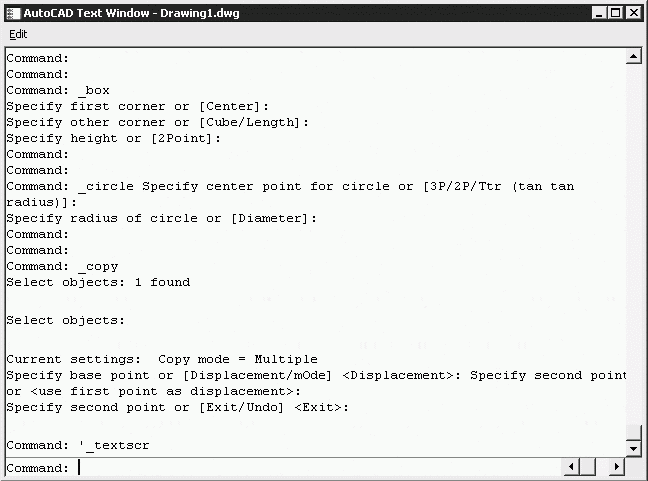 Текстовое окно подобно окну команд: в нем также можно вводить команды, наблюдать подсказки и сообщения, выдаваемые AutoCAD. Для перемещения по окну используются полоса прокрутки или клавиши ^, V, <-, ->, Page Up и пр.