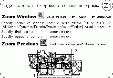 Zoom Previous – использование предыдущего вида рисунка. Вызывается из падающего меню View -> Zoom -> Previous либо щелчком на пиктограмме Zoom Previous на стандартной панели инструментов. При работе с мелкими деталями часто возникает необходимость уменьшить изображение, чтобы просмотреть сделанные изменения в общем виде. Для быстрого возврата к предыдущему виду служит команда ZOOM с ключом Previous. Она восстанавливает только экранное увеличение и положение вида, но не содержимое редактируемого рисунка.