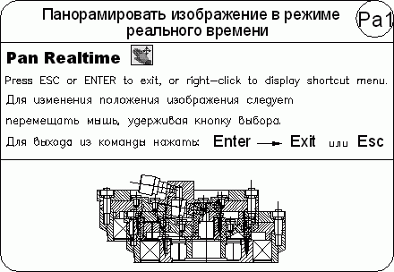 Чтобы изменить положение изображения на видовом экране в режиме панорамирования в реальном времени, следует перемещать указатель мыши, удерживая ее левую кнопку нажатой. Панорамирование может выполняться в одном направлении до тех пор, пока не потребуется полная регенерация изображения или не будут до стигнуты лимиты рисунка. В этом случае к изображению указателя панорамирования добавляется соответствующий направлению символ-ограничитель.