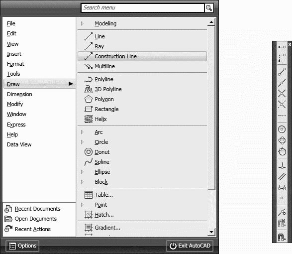 Рисунки в AutoCAD строятся из набора геометрических примитивов. Под геометрическим примитивом понимается элемент чертежа, обрабатываемый системой как целое, а не как совокупность точек или объектов. Геометрические примитивы создаются командами вычерчивания или рисования, которые вызываются из падающего меню Draw или с одноименной панели инструментов (рис. 8.1). Необходимо отметить, что одни и те же элементы чертежа могут быть получены по-разному, с помощью различных команд вычерчивания.