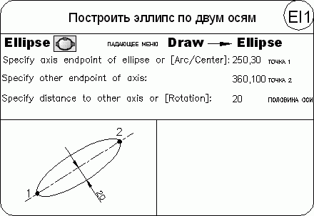 Имеется возможность строить эллипсы и эллиптические дуги, причем с математической точки зрения эти объекты – действительно эллипсы, а не какие-либо аппроксимирующие их кривые. По умолчанию построение эллипсов производится путем указания начальной и конечной точек первой оси, а также половины длины второй оси. Самая длинная ось эллипса называется его большой осью, самая короткая – малой. Оси могут определяться в любом порядке.
