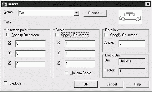 При включении блока в чертеж AutoCAD обрабатывает его как графический примитив. Для обеспечения работы с его отдельными составляющими блок необходимо разбить, или взорвать. Это можно сделать и в момент вставки его в рисунок, установив в диалоговом окне Insert флажок Explode.