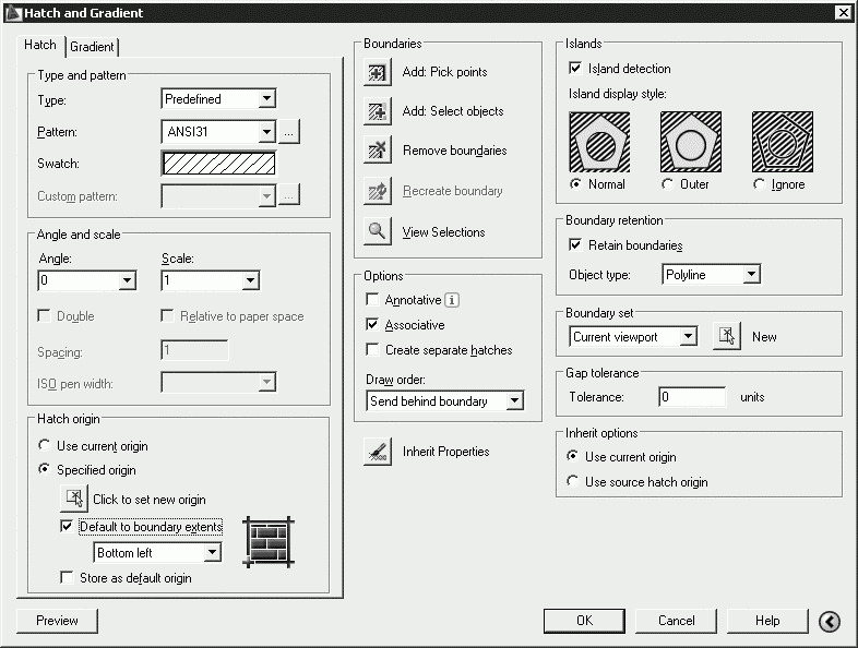 Остальные параметры аналогичны параметрам вкладки Hatch диалогового окна Hatch and Gradient.