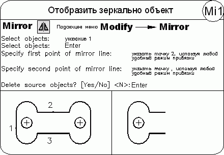 Команда MIRROR осуществляет зеркальное отображение объектов. Она вызывается из падающего меню Modify -> Mirror или щелчком на пиктограмме Mirror на панели инструментов Modify.