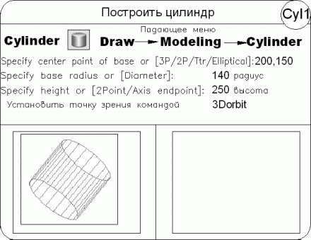 Информация, необходимая для описания цилиндра, аналогична той, что используется для описания конуса, поэтому запросы команды CYLINDER совпадают с запросами команды CONE.