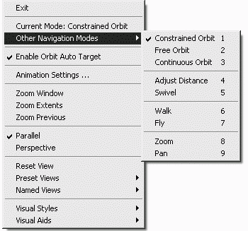 В процессе постоянного вращения по орбите остаются доступными опции контекст ного меню, позволяющие задать тип проекции, режим раскрашивания, активные средства визуализации, восстановить вид, установить стандартный вид. Если выбрать из контекстного меню какой-либо из пунктов: Pan или Zoom, вращение останавливается.