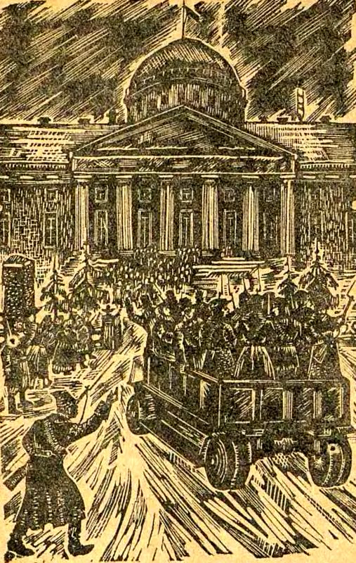 У Таврического огромная толпа. На улицах трещат костры. Мороз. Таврический дворец сияет огнями. Во всех его комнатах в эту ночь горит свет.