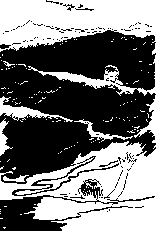Буря заглушала слова. Пионер крутился на одном месте, не решаясь плыть или выбраться через барьер, но вот он поплыл.