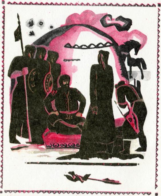 В глухую полночь добрались лучники до него. И как был Сабанай опутан цепями, так и кинули его в озеро, поспешив скорей уйти от того жуткого места.