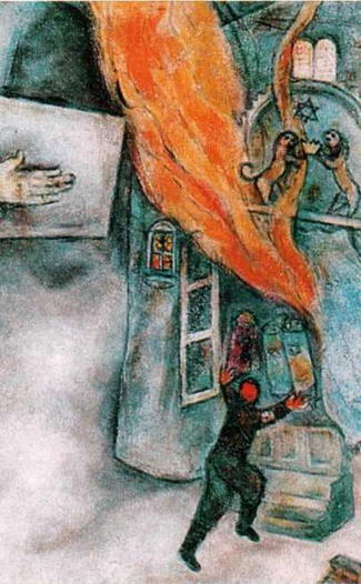 Смерть Христа как залог спасения вызывает к жизни ряд образов, вводящих в картину тему религиозного единства, являющего собой основу согласия и свободы. Так, вновь возникает мотив лестницы у распятия (мотив присутствует также в картине "Голгофа" 1912 года), в древней византийской иконографии символизировавший Страсти Господни. В ужасе бежит прочь старик (деталь внизу), стремясь спасти священные свитки Закона. На фасаде синагоги (деталь сверху) в языках пламени можно различить двух львов.