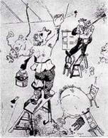Маяковский не искал в цирковых аттракционах и заплатках на клоунском костюме простого сочетания линий и цветов, экзотической и сказочной сущности, но пользовался этой атмосферой, дабы погрузить в нее блистательных персонажей своих политических карикатур. Шагал, равно как и Блок, Белый, Клее, Бекман, изображает клоунов и канатоходцев как мифический народ, метафорическое племя. На полотнах Шагала, как и в стихах Блока и Белого, скоморохи приобретают волшебные, сказочные черты, больше того - превращаются в чудесных существ, как образы икон или легенд. Шагал соперничает в гибкости с акробатом и бросает вызов виртуозной ловкости жонглера.