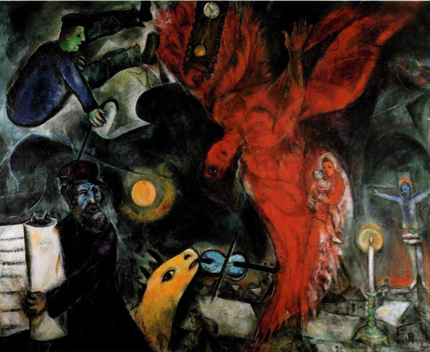 В живописи Шагала образ Христа появился довольно рано. "Голгофа" 1912 года (см. стр. 29), ныне хранящаяся в нью-йоркском Музее современного искусства, — это картина, имеющая большое значение не только в творческой эволюции художника, но и вообще в искусстве нашего века. Христианская иконография претерпевает серьезные изменения, и в результате приглушается обычная трагическая интонация и возникает ощущение какой-то жестокой игры, разрешающейся в финальном катарсисе.