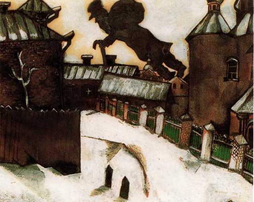 О браз Витебска проходит через все обширное творческое наследие Шагала. В Париже, куда он приезжает в 19Ю году, Шагал боится смешаться с тридцатью тысячами работающих в городе художников. И тогда его поддерживает воспоминание о родном Витебске. Перед тем как уехать из Витебска, художник молился и просил у Бога послать ему знамение: "В ответ город словно раскололся на части, лопнул, как скрипичная струна, и все жители стали ходить над землей, покинув свои привычные места. Старые знакомые расположились отдохнуть на крышах". Шагал со вниманием отнесся к новому художественному языку кубистов, но для него анализ объективной реальности и применение заимствованных из геометрии приемов для достижения выразительности имеют смысл только при условии, что главная роль в картине отведена свободному полету фантазии. Люди, очеловеченные животные и перевернутые фигуры создают тот театр, что берет свое начало в памяти, где сожаление соседствует с благодарностью.