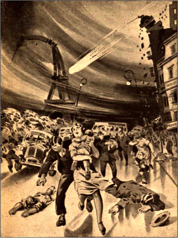 С Парижа, собственно, и началась всеобщая паника. Импульсивные французы, давно уже, в сущности, не имеющие подлинного крепкого духа, который помог бы им пережить это испытание, не выдержали и первые нарушили одну общую организованную систему, которой подчинялись до сих пор все. Лозунг: «Спасайся, кто может» — был брошен, и люди стали искать спасения сами, штурмуя транспортные средства в Марселе и Бордо, когда шар только покидал Париж. Из Франции паника перебросилась на остальную Европу и весь мир… Люди брали с боя места в еще неоконченных пещерах, где потом задыхались от недостатка воздуха… Грабились и уничтожались огромные склады продовольствия… В других местах начался повальный голод, так как все транспортные артерии были нарушены… О выполнении долга никто уже не думал, и во всех глазах горел один всепокоряющий, непобедимый и нерассуждающий страх. В странах, более удаленных от районов непосредственной опасности, но наиболее неустроенных экономически и с несовершенной политической структурой, где народ до сего времени бедствовал под неумело слабым или преступно-жестоким управлением, — произошли грандиозные кровавые революции и смены режимов, хотя делалось все это скорее стихийно, так как никто теперь уже не сомневался в том, что всеобщий неумолимый и страшный конец — грядет, и скоро человечеству придется искупить все свои грехи… Над всей Землей простер свою руку ужас и повис дикий, душераздирающий вопль отчаяния…